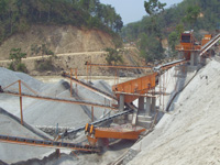 我公司提供的成套設備,可根據用戶加工物料的種類、用途、規模、地形的不同,現場設計、指導安裝調試。主要設備有振動喂料機、鄂式破碎機、PF系列強力反擊破碎機、液壓圓錐破碎機、PL立式沖擊破碎機、圓振動篩、XL系列砂石洗選機(濕法)、NXH系列先粉機(干法)、除塵器(干法)、以及輸送、電器等設備組成。根據大小不同,可以作成移動式,半移動式,固定式等多種型式。成品粒度一般在40-5mm骨料和0-5mm人工砂。骨料呈立方體,針片狀含量較少,人工砂符合中、粗砂標準。