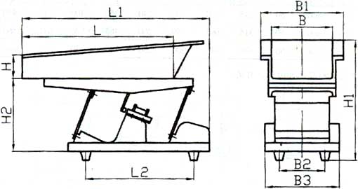 電磁振動給料機的振幅和給料量受料倉倉壓影響較大,設計料倉時應盡量減少倉壓,使溜咀后側板承受一定的倉壓,并設置斜溜沮及下料閘門。如圖,一般a=1/4b。溜咀四周應與給料槽留有一定的間隙,一般5~10mm,以免產生噪音及影響振動。